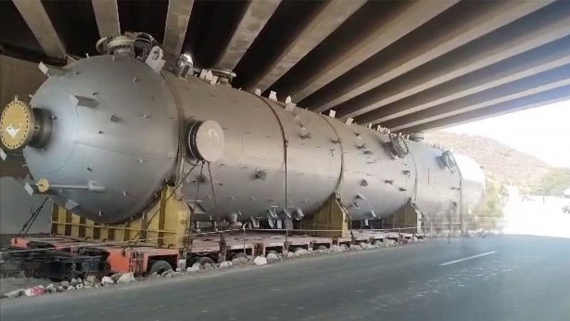 A specialised axle trailer (only one available in Oman) navigated the first leg from Nizwa to Duqm port, a 10-day operation requiring custom road permits and movement only during daylight.